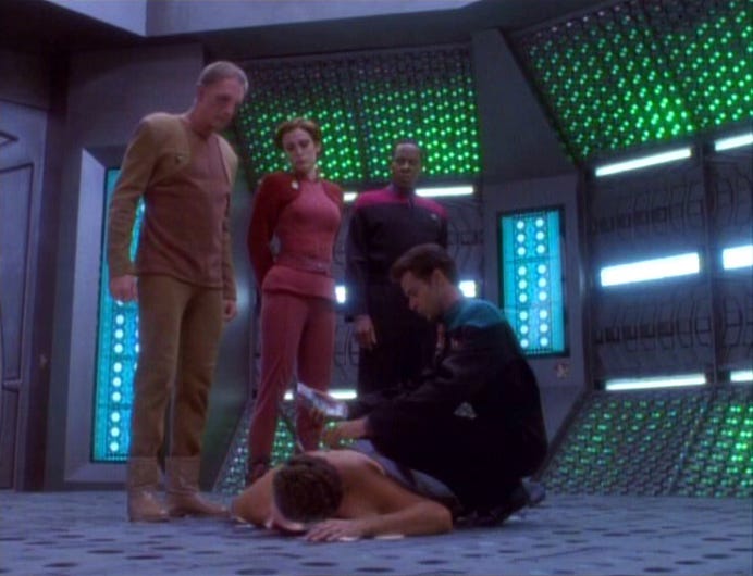 But we’re about to see how deep that trust really runs. Into this stewpot of social change steps Ibudan, a Bajoran whom Odo once sent to jail for murder. The two men clash publicly; hours later, Ibudan is stabbed to death. As the station crew begins to investigate, a case starts to form against Odo. And with Odo on the hook for the murder of a Bajoran, the station’s community starts to turn against him. A mob forms, and just when it seems like Odo’s done for, the station doctor arrives to announce a startling break in the case: the murdered man wasn’t Ibudan.